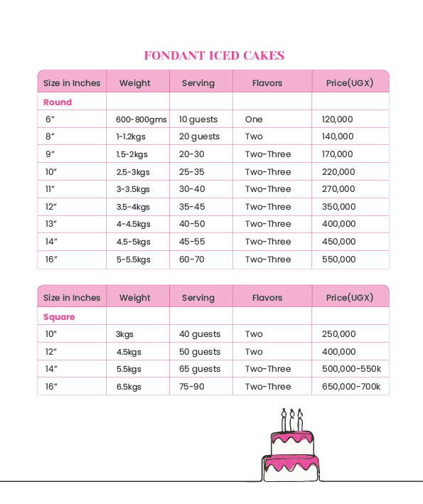 We have assembled a table to help you determine what size of your favorite cake you will need for the number of guests you have invited to the party. The cake size and serving charts are based on party-sized portions of 6 inches to 12 inches or smaller cakes with their estimated weight and serving recommendation. The number of servings is intended as a guide only. You can cut into cube shape or smaller slices for more serving.